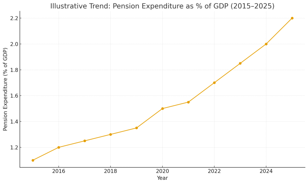 - Figure 1 shows a steady rise in pension outlays relative to GDP, reflecting demographic ageing, earlier hiring bulges reaching retirement, and salary revisions feeding through to pension bases.