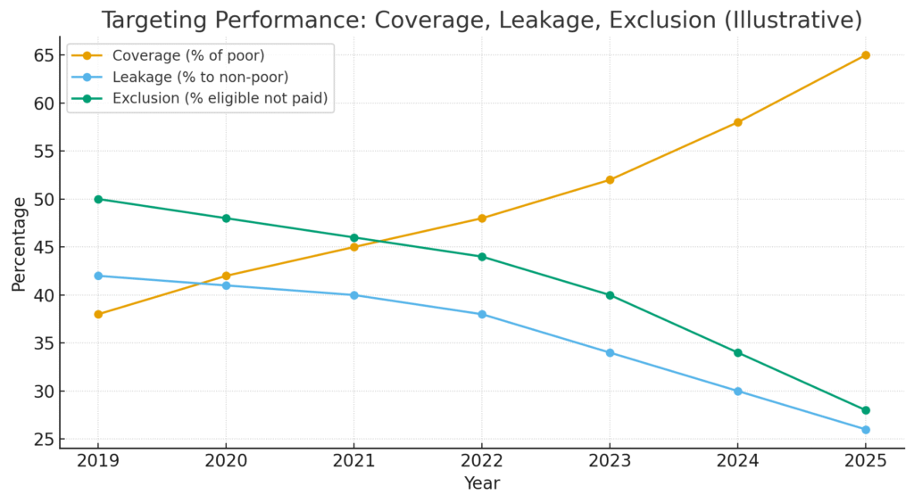 The illustrative chart below shows the direction a reform should target: rising coverage with falling leakage and exclusion over time.